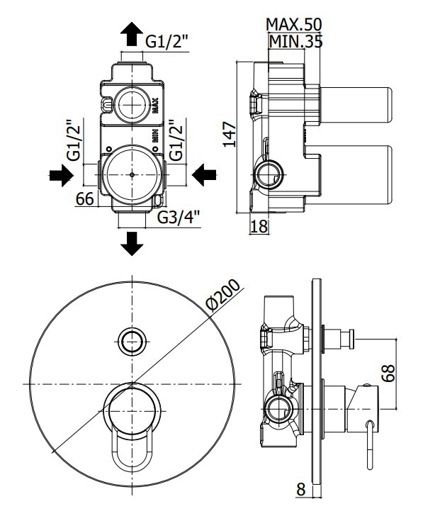 - przyłącza 1/2”G ciepło/zimno i górne - przyłącze dolne 3/4”G