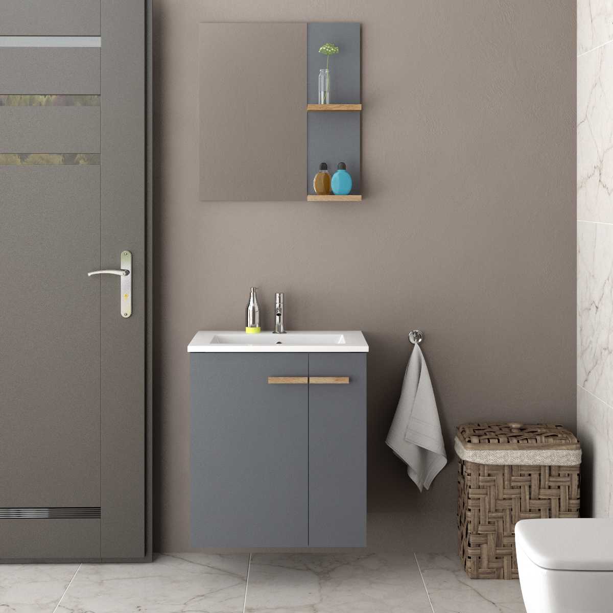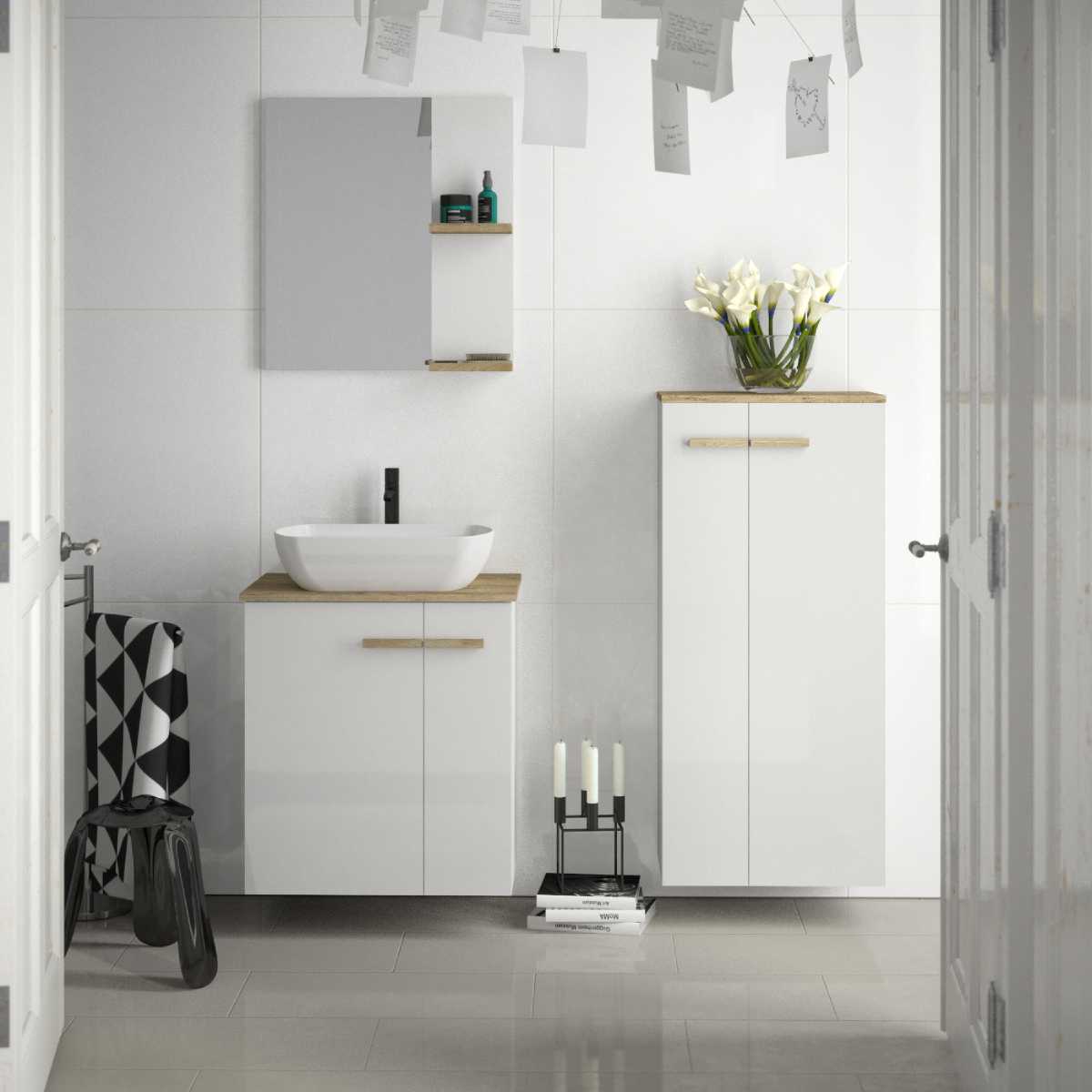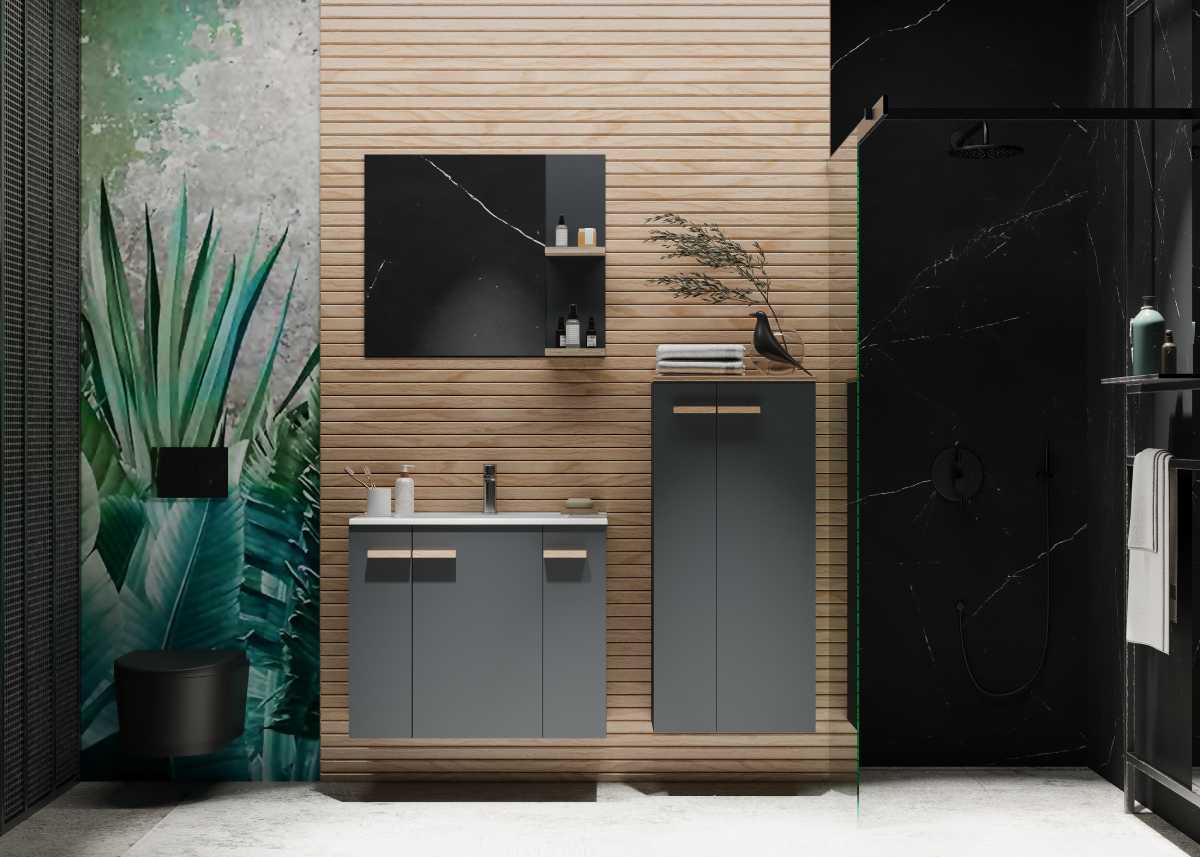 Szafka podumywalkowa z tej kolekcji, mimo kompaktowych wymiarów, zapewnia dużą powierzchnię do przechowywania dzięki przestronnej dolnej części. Biała umywalka o opływowym kształcie idealnie kontrastuje z prostymi liniami szafki, nadając całości lekkości i nowoczesności. Wyposażenie w praktyczne uchwyty i łatwo otwierające się drzwi zwiększa funkcjonalność mebli, ułatwiając codzienne korzystanie z przestrzeni łazienkowej.