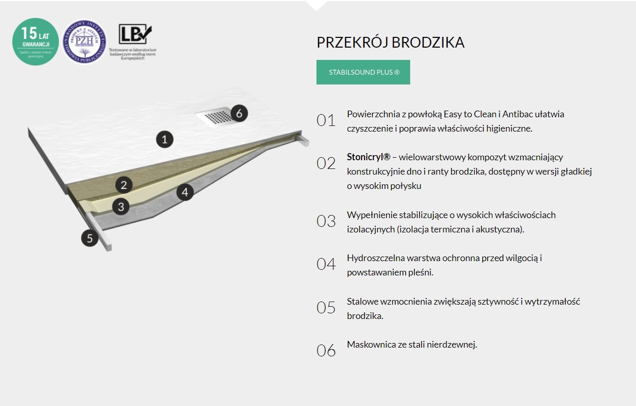 Brodziki z serii Stabilsound Plus wykonane są z wysokiej jakości akrylu. Wyróżnia je zintegrowana forma i specjalnie wzmocniona konstrukcja, co sprawia , że brodziki są trwałe, solidne oraz odporne na zwilgocenia i zgrzybienia. Dodatkowo konstrukcja brodzika wzmocniona jest o metalowe elementy, co zwiększa wytrzymałość brodzika na ciężar do nawet 1500 kg. Wszystkie te zastosowane technologie gwarantują komfort zarówno już przy montażu jak i podczas wieloletniego użytkowania.
