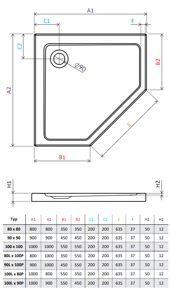 Ronal Bathrooms Calce Brodzik prostokątny asymetryczny MineraLite 100x90 cm antracyt (W31AS10009017)