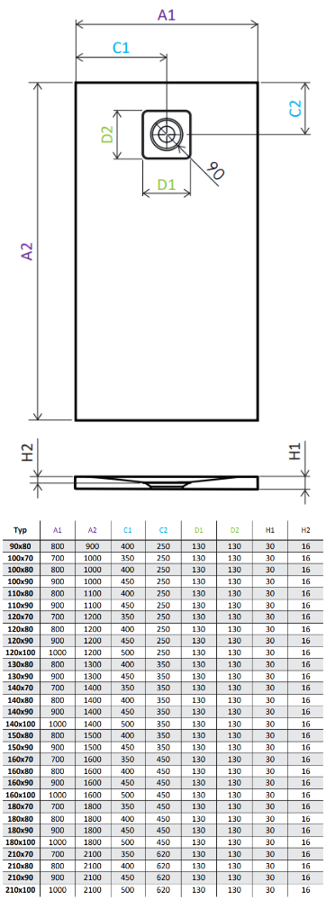 brodzik konglomeratowy prostokątny z odpływem na krótszym boku Cemento 130 x 80 cm