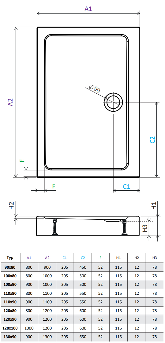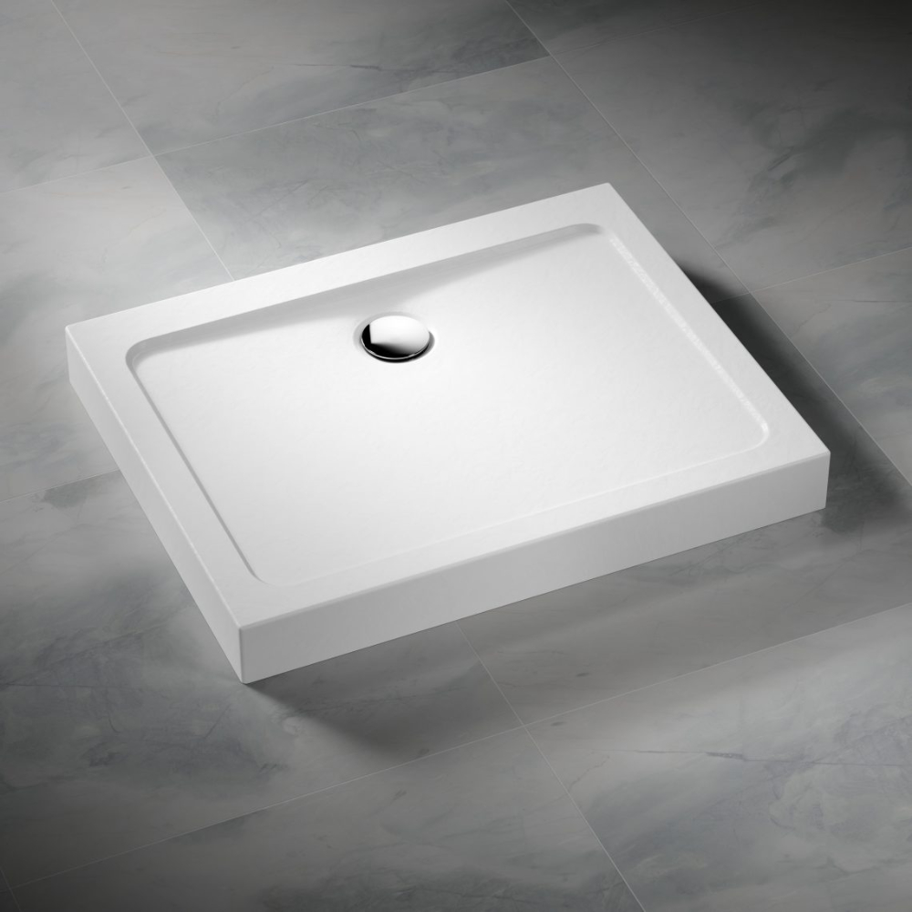 brodzik akrylowy prostokątny z odpływem na dłuższym boku Stone biały 100 x 80 cm