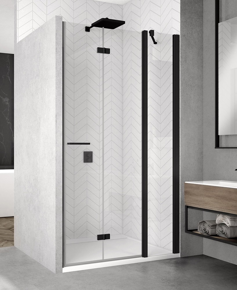 Drzwi dwuczęściowe składane ze ścianką stałą w linii czarne, Szkło przezroczyste