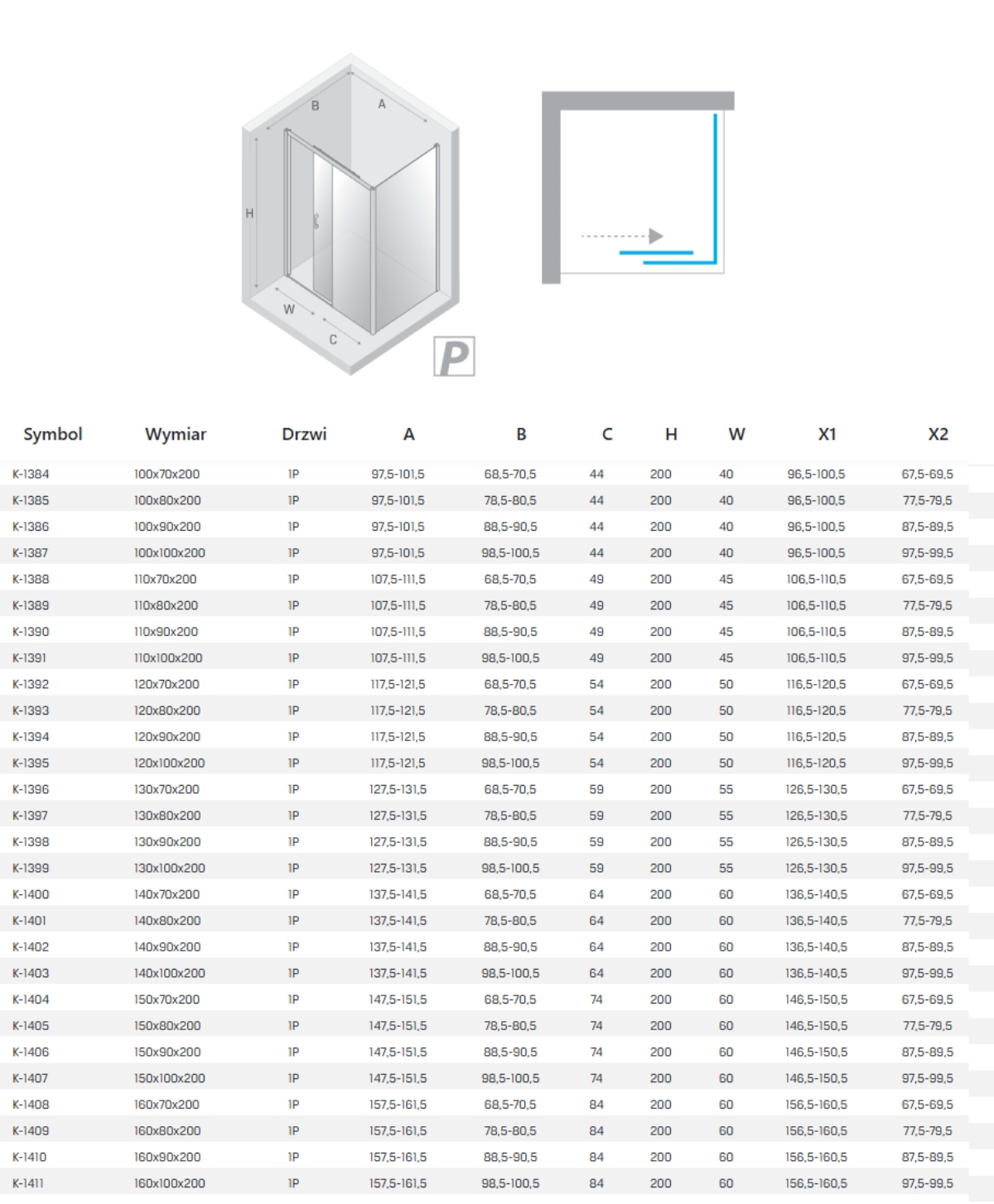 W przypadku montażu kabiny na posadzce zwróć uwagę na wymiar do osi szyby - patrz wymiar x1 x2