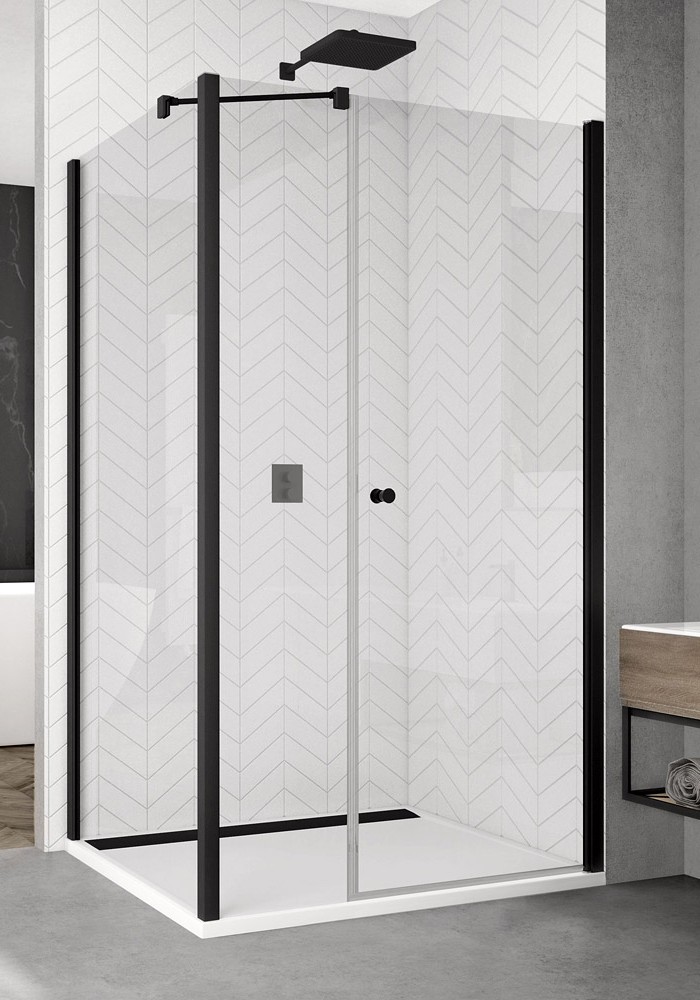 Drzwi jednoczęściowe ze ścianką stałą w linii + Ścianka boczna czarna, Szkło przezroczyste