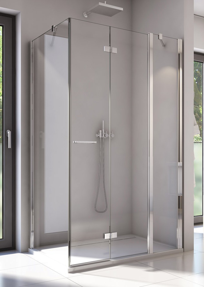 Drzwi dwuczęściowe ze ścianką stałą w linii + Ścianka boczna chrom, Szkło przezroczyste