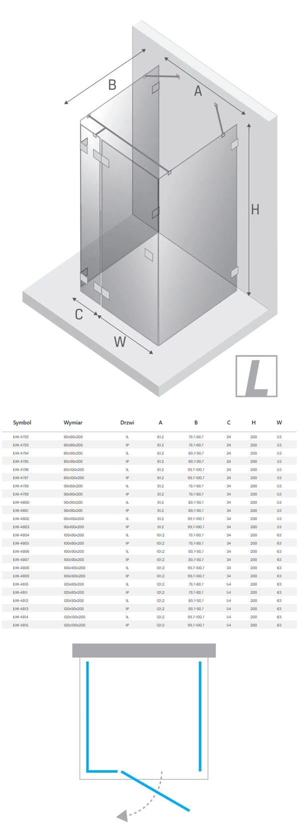 W przypadku montażu kabiny na posadzce zwróć uwagę na wymiar do osi szyby - patrz wymiar x1 x2