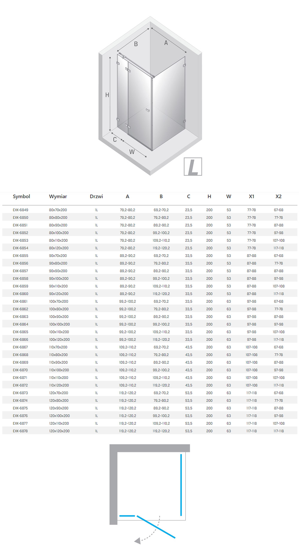 W przypadku montażu kabiny na posadzce zwróć uwagę na wymiar do osi szyby - patrz wymiar x1 x2