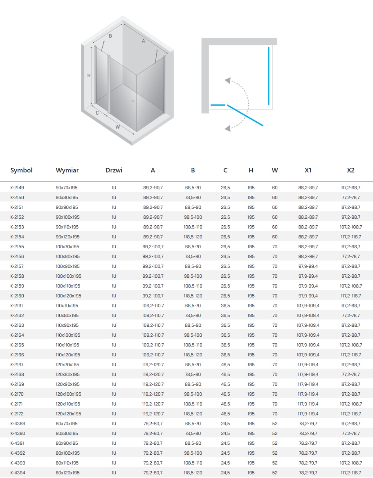 W przypadku montażu kabiny na posadzce zwróć uwagę na wymiar do osi szyby - patrz wymiar x1 x2