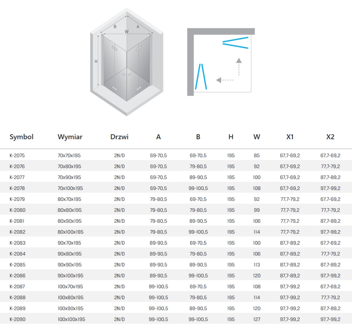 W przypadku montażu kabiny na posadzce zwróć uwagę na wymiar do osi szyby - patrz wymiar x1 x2