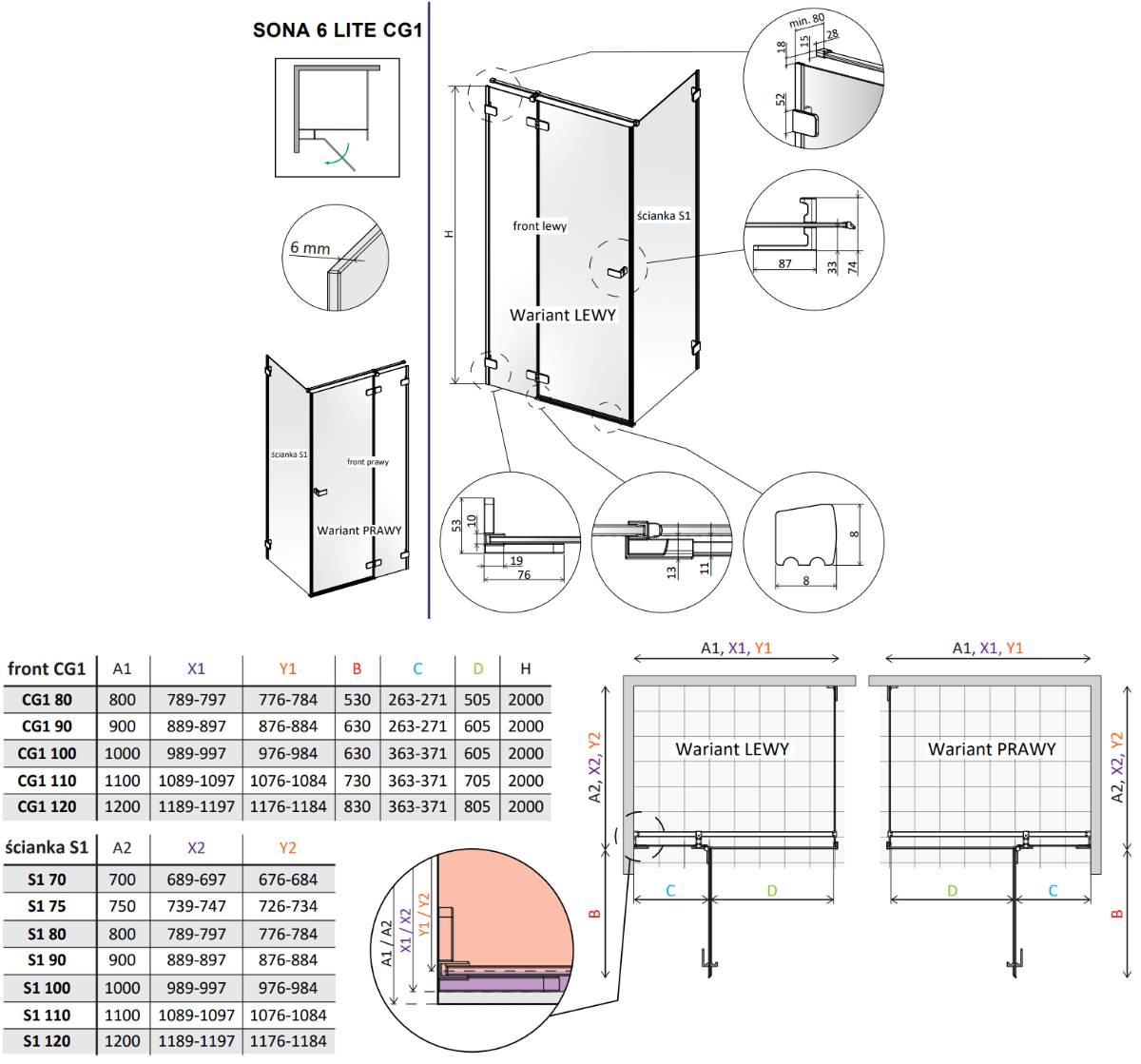 Sona 6 Lite to kabina z drzwiami otwieranymi na zewnątrz, która łączy w sobie subtelną konstrukcję z wytrzymałością szkła hartowanego o grubości 6 mm. Jej wyróżnikiem jest system montażu oparty na eleganckich klamrach, które zostały uzupełnione o dodatkowy, cienki profil do ściany, zapewniający idealne wykończenie i stabilność.