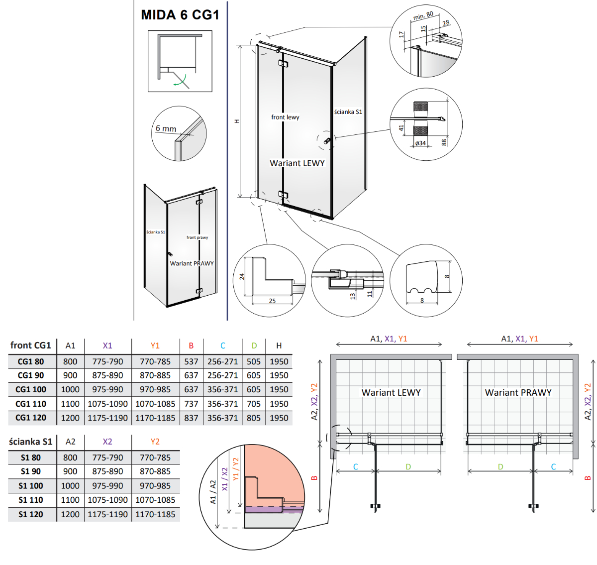 Seria Mida 6 to klasyczne kabiny z drzwiami otwieranymi na zewnątrz, które stanowią idealne połączenie prostoty formy z wysoką funkcjonalnością. Kluczowym elementem konstrukcyjnym jest tutaj system montażu do ściany za pomocą profili, który nie tylko zapewnia stabilność, ale także umożliwia niwelację ewentualnych krzywizn ściany, gwarantując perfekcyjny montaż.