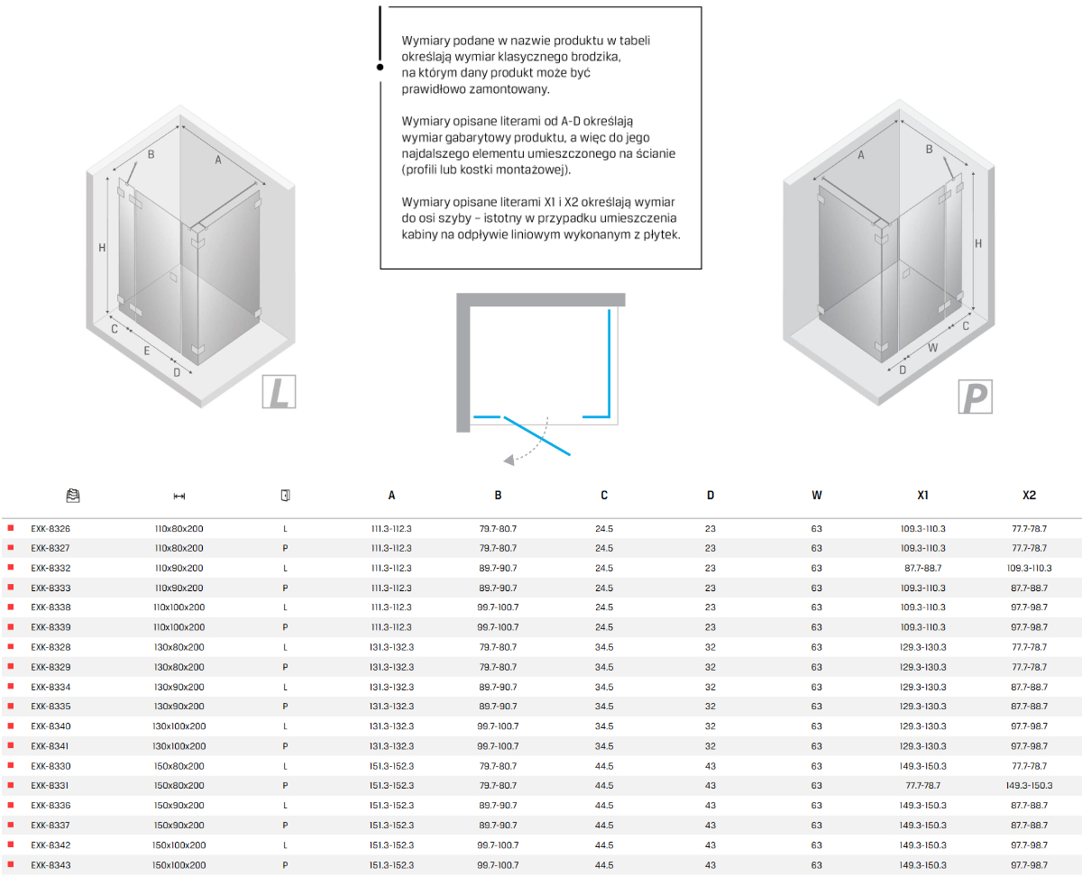 W przypadku montażu kabiny na posadzce zwróć uwagę na wymiar do osi szyby - patrz wymiar x1 x2