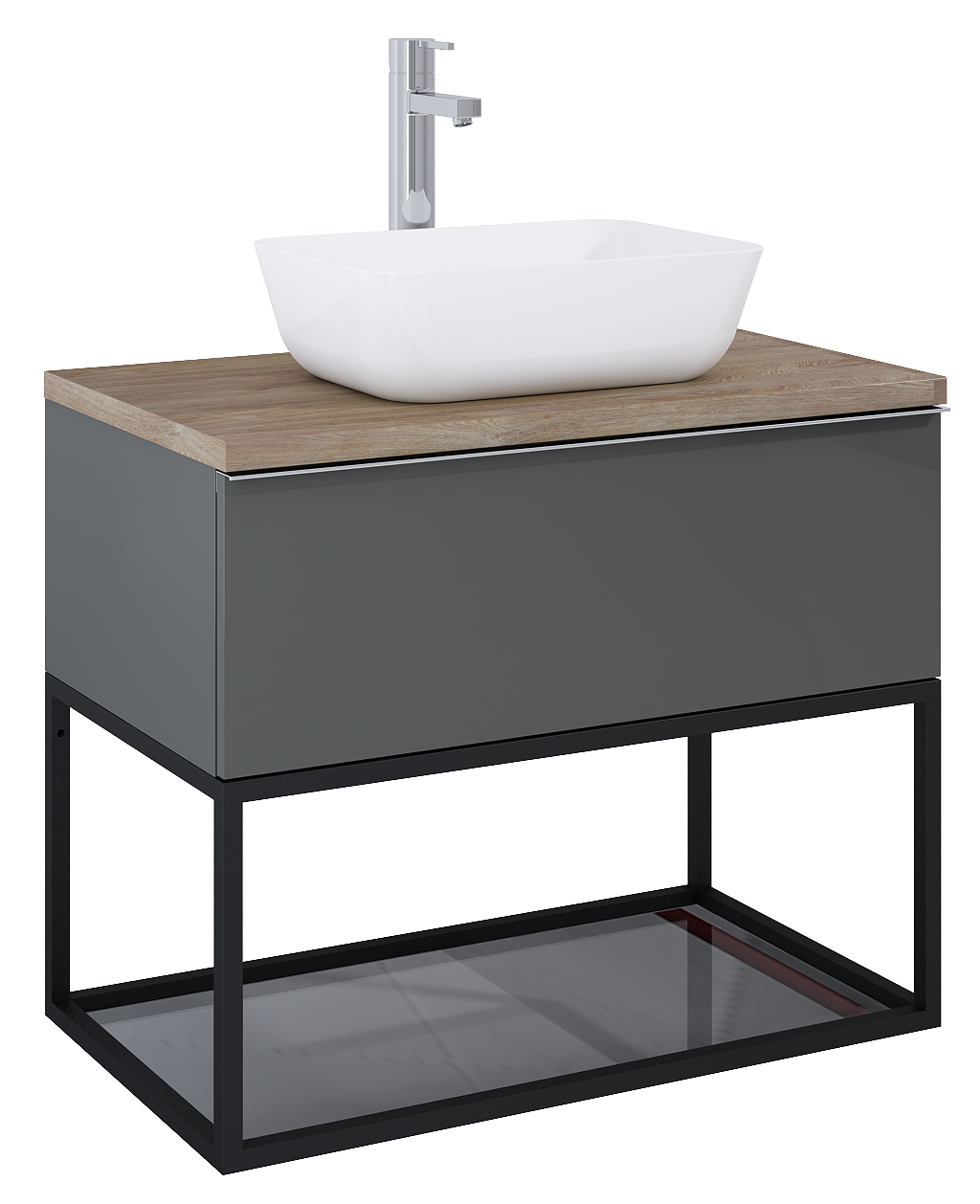 Nowoczesny, metalowy stelaż podszafkowy w kolorze black ze szklaną półką. Rozmiar 80 cm. Stelaż idealnie uzupełni szafki i komody z kolekcji Look, tworząc dodatkową przestrzeń na przedmioty codziennego użytku.