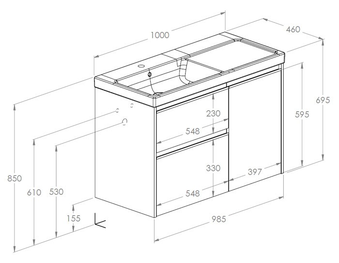 ZESTAW ŁAZIENKOWY UNIK SZAFKA Z KOSZEM CARGO + UMYWALKA LEWA 100 CM