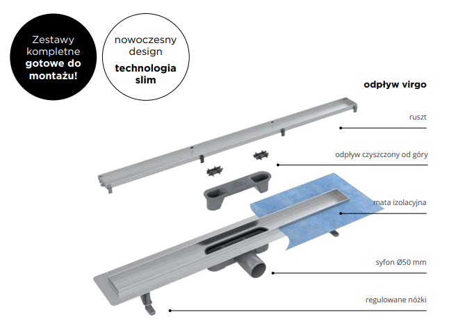 Odpływy liniowe firmy Besco wykonane są z najwyższej jakości materiałów, które cechuje przede wszystkim idealnie gładka powierzchnia, aby zapewnić jak najlepszy wygląd oraz całkowicie wodoszczelną instalację odpływu prysznicowego i bezproblemowe dopasowanie do każdej podłogi. Odpływ liniowy Virgo jest dostarczany jako kompletny zestaw wyposażony w rynienkę z syfonem i nóżkami montażowymi, ruszt oraz matę uszczelniającą.