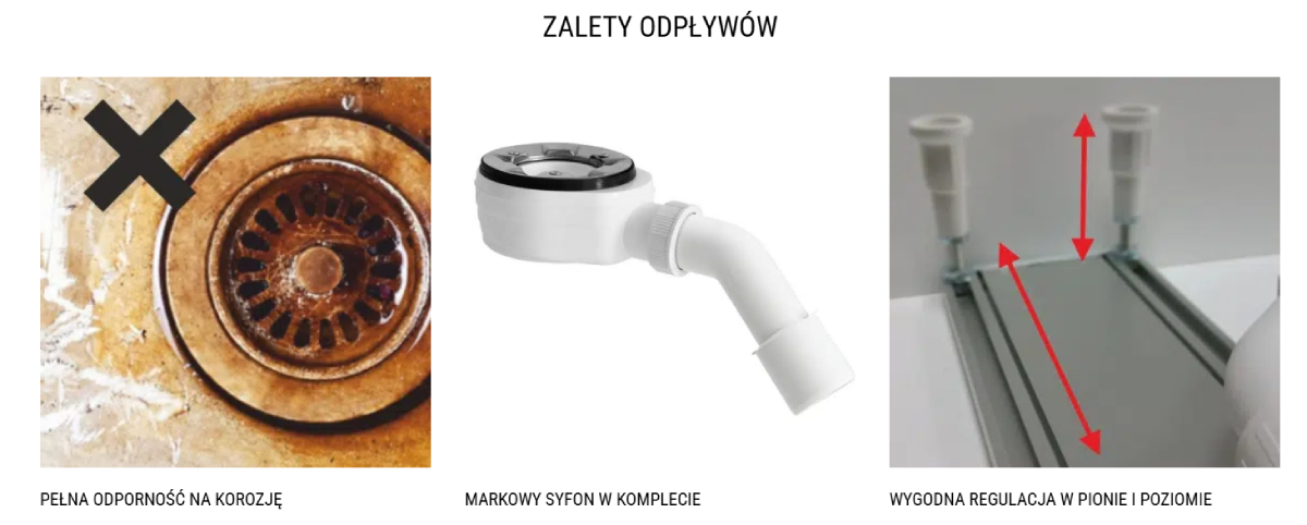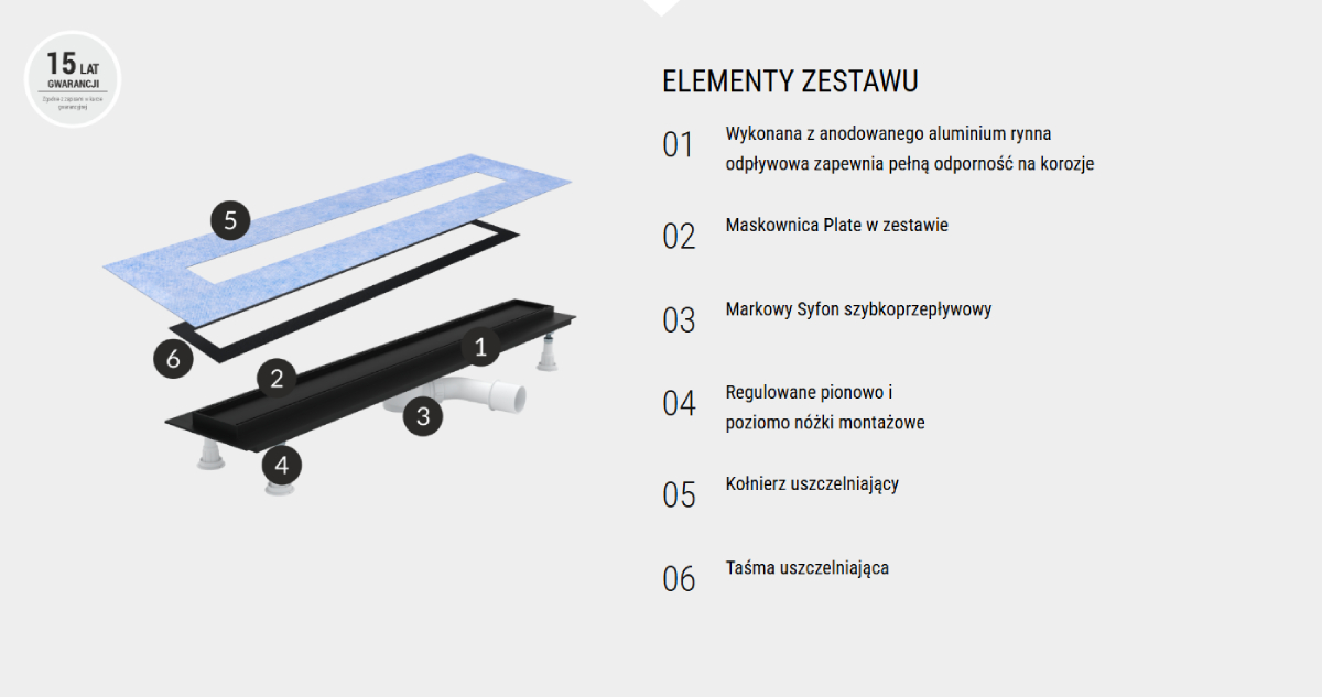 - Wykonana z anodowanego aluminium rynna odpływowa zapewnia pełną odporność na korozję