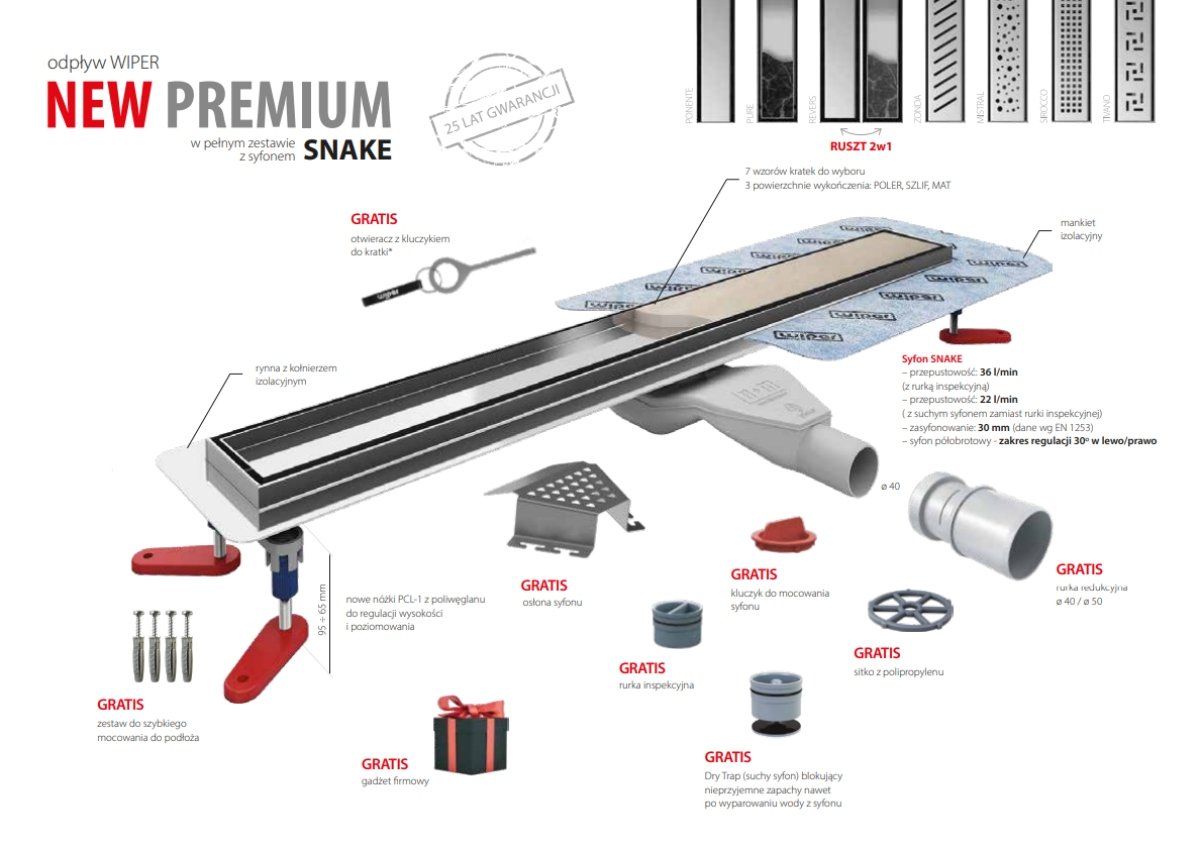 | Skład zestawu | Korpus odpływu liniowego · Kratka odpływowa · Syfon · Nóżki regulacyjne · Mankiet uszczelniający |