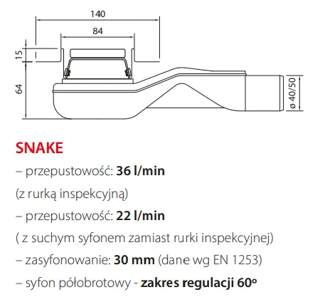 Syfon Snake to nowoczesny syfon o unikalnej konstrukcji, który charakteryzuje się wysokością zabudowy w posadzce wynoszącą 63 mm. Ze względu na swoją budowę, syfon można zamontować tylko pod kątem prostym (+/-15°), co zapewnia jego prawidłowe działanie. Idealny do przestrzeni wymagających precyzyjnego montażu.