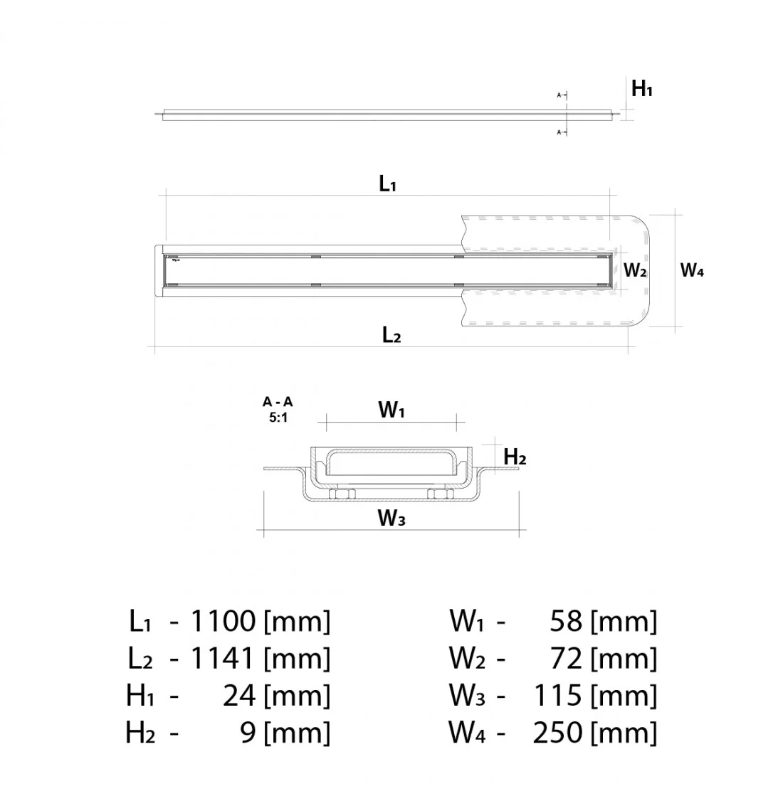 Pure Odpływ liniowy 110 cm z niskim syfonem drop 50