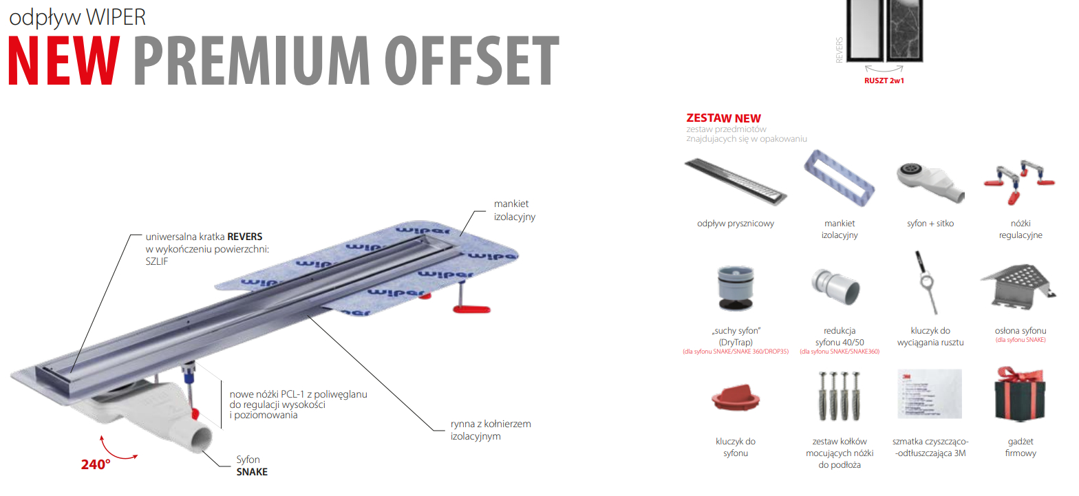Wiper New Premium Revers (ruszt 2w1) Odpływ liniowy 100 cm z obrotowym syfonem Snake 360 - Zestaw...
