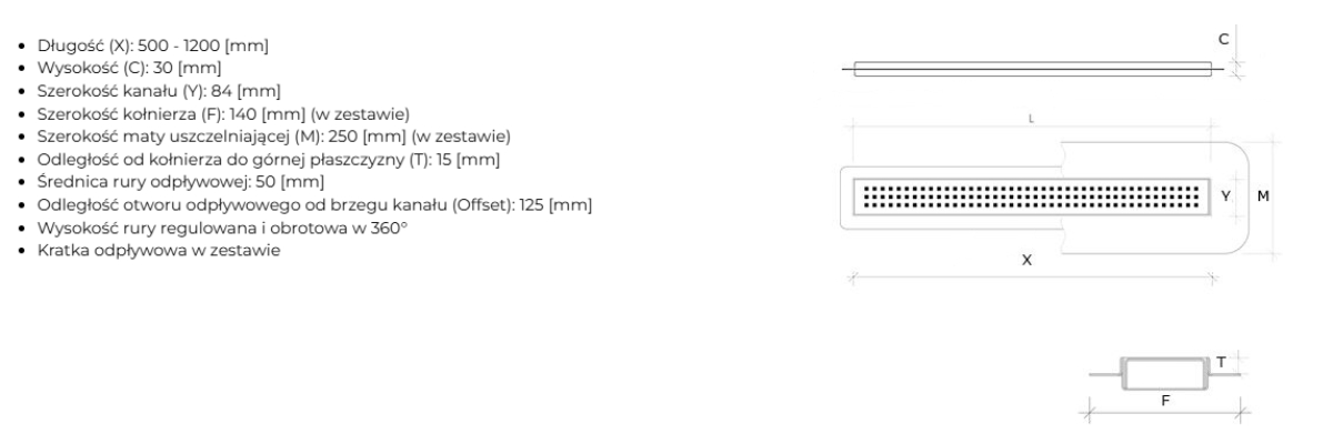 | Skład zestawu | Korpus odpływu liniowego · Kratka odpływowa · Syfon · Nóżki regulacyjne · Mankiet uszczelniający |
