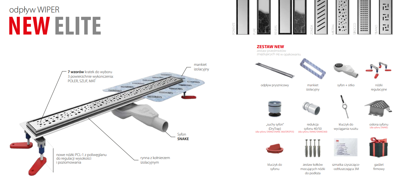 Wiper New Elite Ponente Odpływ liniowy 60 cm z niskim syfonem snake - Zestaw...