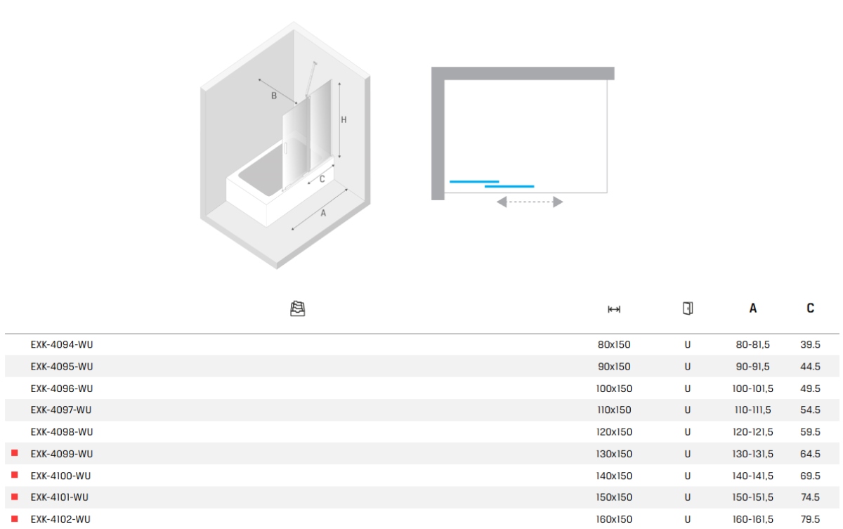 New Trendy Avexa Parawan Wannowy 130x150 cm Skrzydło Pojedyncze Uchylne Prawe Szkło Przezroczyste...