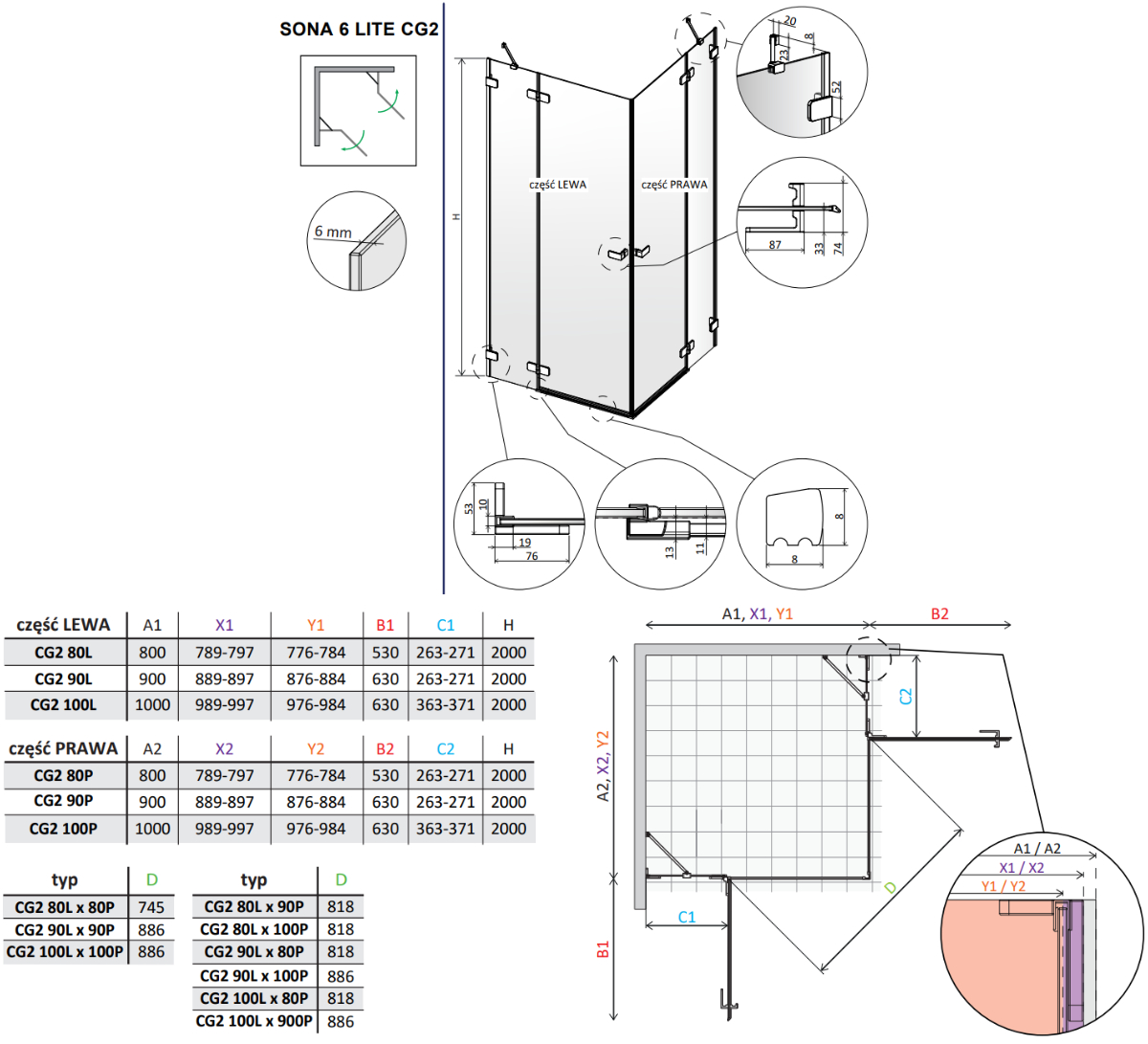 Vixor Sona 6 Lite CG2 Kabina prysznicowa prostokątna gunmetal szczotkowany 90Lx100P cm (N02-21090-92-01L+N02-21100-92-01R)