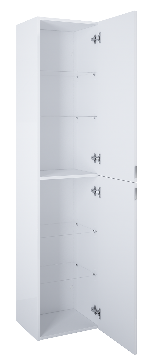 Słupek For All 40 cm, 2 drzwiczek. Słupek z subtelnym metalowym uchwytem w kolorze chrom, wyposażony w 4 półki z regulowaną wysokością. Wykonany z materiałów wysokiej jakości, front i korpus lakierowany w kolorze white, zawiasy z cichym samodomykiem. Słupek może stanowić uzupełnienie wszystkich kolekcji mebli łazienkowych z naszej oferty.
