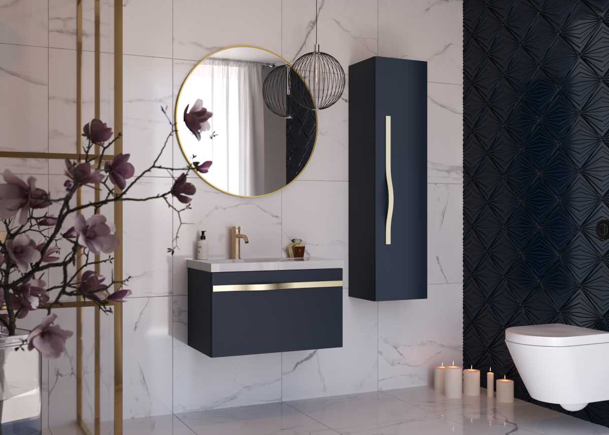 Kolekcja mebli łazienkowych e-VOG od Krofam to synonim nowoczesnej elegancji i funkcjonalności. Charakteryzuje się minimalizmem połączonym z wyrafinowanymi akcentami, co widać na przykładzie idealnie dobranych materiałów i subtelnych złotych detali. Granatowe fronty, które są dostępne także w wersji białej, idealnie komponują się z marmurowymi płytkami i dodatkami w odcieniach złota, tworząc wnętrze, które przyciąga wzrok swoją wyrafinowaną prostotą. To wybór dla tych, którzy pragną dodać swojej łazience wyjątkowego stylu.