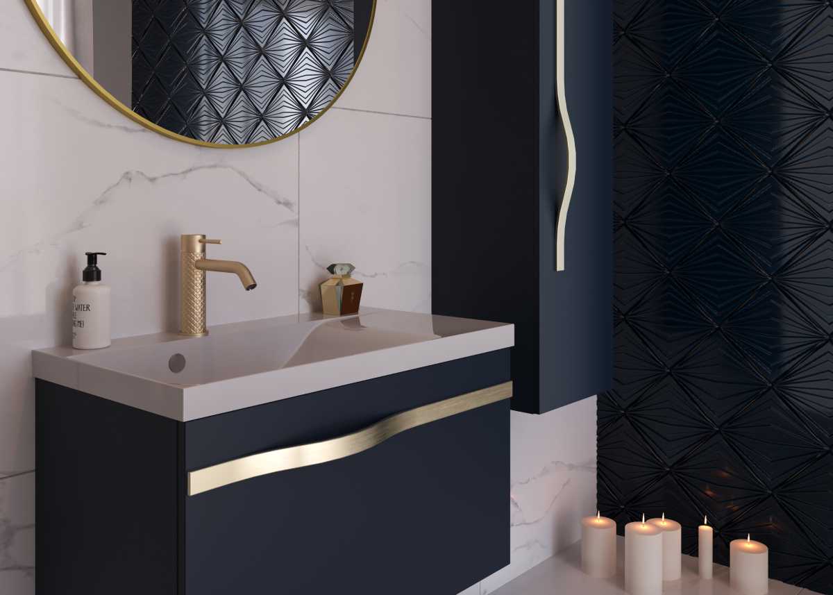 Kolekcja e-VOG wyróżnia się również starannie dobranymi materiałami. Granatowe fronty, delikatnie podkreślone złotymi akcentami, nadają całości luksusowego charakteru, jednocześnie zachowując nowoczesny minimalizm. Blat szafki i elegancka armatura w odcieniu mosiądzu doskonale komponują się z pozostałymi elementami wnętrza, tworząc harmonijną przestrzeń, w której estetyka i praktyczność idą w parze.