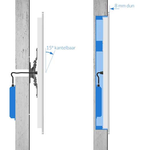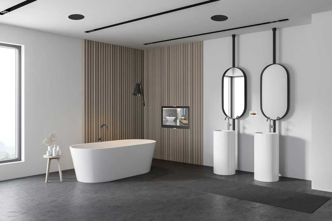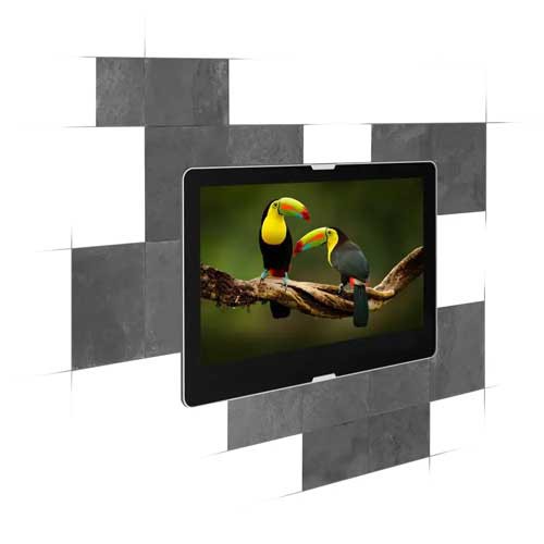 Jeden telewizor w dwóch wersjach. Wybierz wbudowany, aby w pełni zintegrować łazienkowy Smart TV ze ścianą. Telewizor może być zamontowany 8 milimetrów od płytek. Eleganckie, minimalistyczne rozwiązanie.