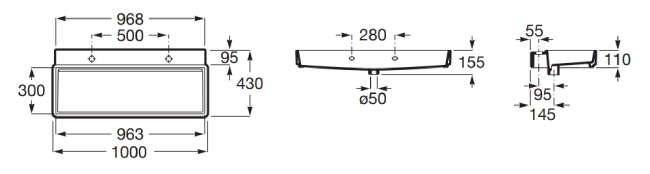Umywalka ścienna / meblowa 100x43 cm z 2 otworami na baterię