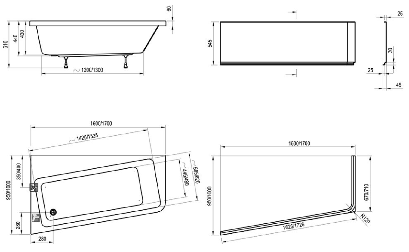 Wanna akrylowa 10° 170x100 P (C821000000+GPX2240396) firmy Ravak